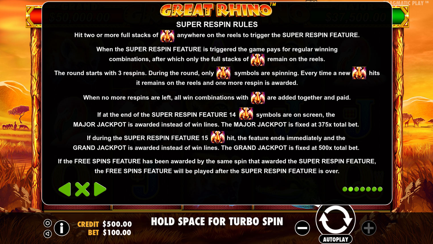 Outre les symboles habituels de cartes hautes, le jeu propose également une variété d'animaux, ainsi que le Wild et le Bonus . Le Wild prend la forme du Grand Rhinocéros, se substituant à tous les autres symboles sur les rouleaux, tandis que le Bonus déclenchera une série de tours gratuits, tout en doublant la mise totale chaque fois qu'il apparaît sur les rouleaux. De plus, il existe également la fonction Super Respin qui vous donnera un coup de pouce substantiel à votre bankroll en déclenchant 3 respins où les symboles Wild formeront leurs propres combinaisons. Cette fonctionnalité est également essentielle pour gagner les deux jackpots possibles - le Major et le Grand. Le Jackpot Majeur vous récompense avec 375x la mise de déclenchement, tandis que le Grand Jackpot vous fournira une mise de 500x.